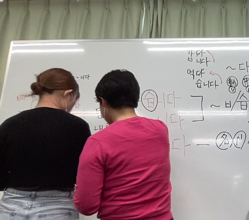 講義は、韓国語の文を理解し、作文をする内容。「語尾活用」の文法は非常に重要な部分。しんちゃんの韓国語が大切にしているのは、大人数の講義であっても一人ひとりの「わからない」を見逃さないことです。